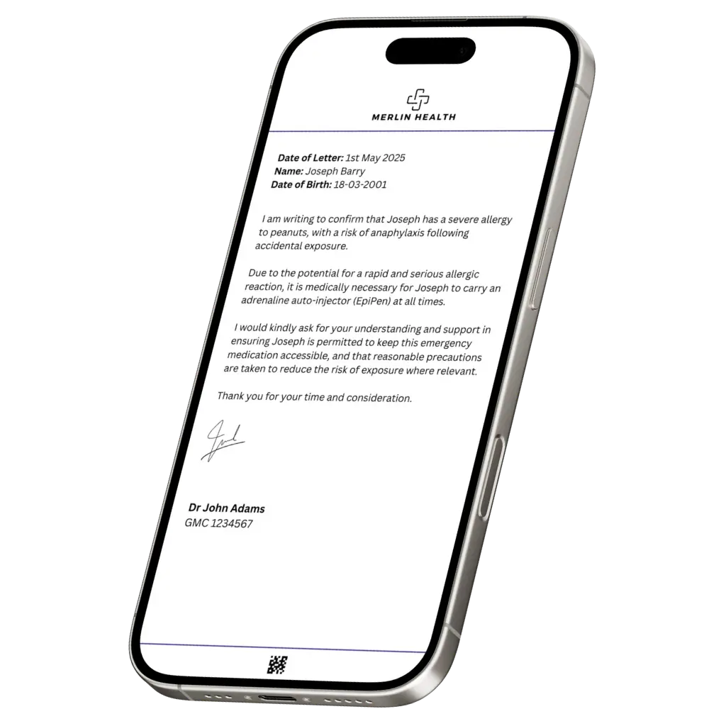 At Merlin Health, we make the process simple and fully online. Your certificate clearly documents the allergy and can support practical requirements such as carrying emergency medication (for example an EpiPen or antihistamines) where appropriate.