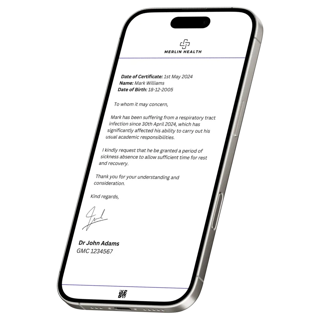 At Merlin Health, our UK GMC-registered doctors issue same-day medical certificates for students who need documentation for illness-related absences, special circumstances, exam rescheduling, or coursework extension requests.