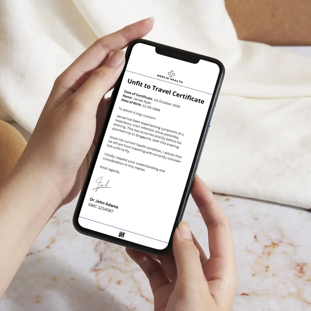 Airlines, insurers, and holiday providers often require this document to support a refund, rescheduling, or insurance claim. With Merlin Health, you’ll receive a single certificate that’s signed by a UK GMC-registered doctor and trusted by travel providers worldwide.